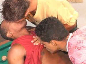 Caldo trio gay sul tavolo da biliardo